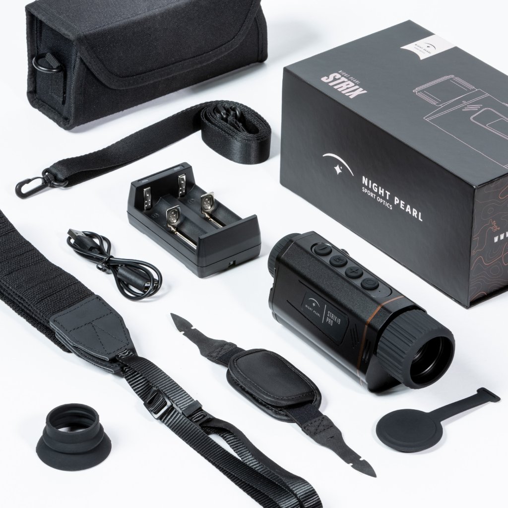Obsah balení: Night Pearl Strix, 2x akumulátor 18650, SD karta 32 GB, gumová očnice, nabíjecí kabel, nabíječka baterií, zápěstní popruh, ochranné pouzdro s přenosným popruhem